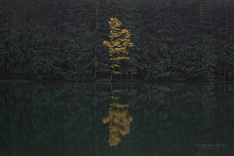 Stand Out   While hiking at Marilla Reservoir in Bradford, PA during a foggy morning sunrise I noticed this solo tree across the lake. The golden leaves were such a strong contrast against the dark green evergreens.